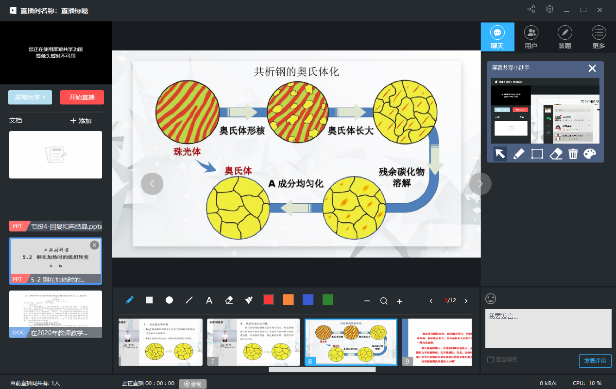 直播互动教学可以打破空间局限,教师借助手机、电脑,跟学生实现远程直播授课,授课同时还可推送教学文档资料,发放教学活动,实现师生互动交流,相当于把传统课程搬移到网络直播间进行。