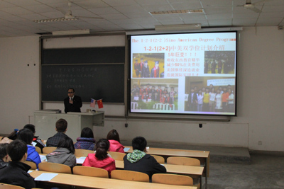 随后,武康先生举办了“中美大学“1-2-1(2+2)”留学项目”专题讲座,为有意赴美留学的同学详细介绍了留学项目的发展历史,并对我校学生赴美留学的相关手续办理问题进行了说明。最后,与我校有意出国留学的同学展开了深入交流,耐心细致地回答同学们的问题。