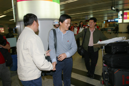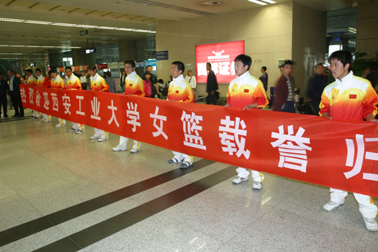 (本网讯)日前,在第30届大学生世界五球锦标赛上,代表中国出战的乐玩在线客服女篮,以7战全胜的战绩为中国捧回冠军奖杯。乐玩在线客服女篮“九朵金花”辗转飞行16小时后,于4月27日19:30抵达西安咸阳国际机场。乐玩在线客服副校长张君安到机场欢迎女篮载誉归来。