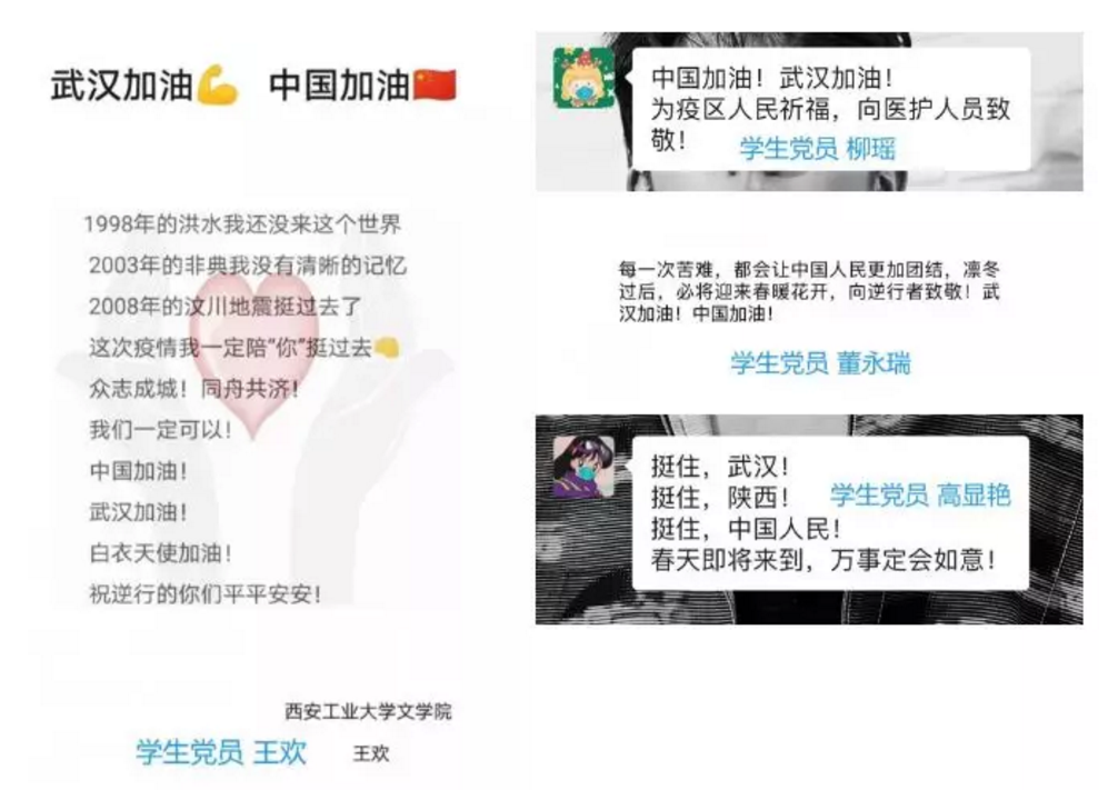 不论是平时的学习生活,还是防治疫情的特殊时期,一个支部就是一个堡垒,一名党员就是一面旗帜,我校全体学生党员庄严承诺,积极响应国家号召,发挥先锋模范作用,坚决遵守疫情防控的相关规定,以实际行动,为党旗增辉,为党徽添彩。