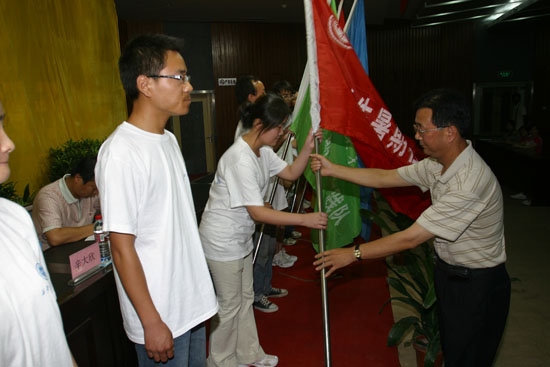 随后,举行隆重的授旗仪式,丁养斌副书记向10支实践队领队代表授旗。主席台上,同学们挥舞着实践队旗,整装待发。