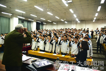 杨清源在报告中运用抗战时期的真实事例让同学们感受到了革命年代的峥嵘岁月,会场上这位86岁高龄的老战士虽几度哽咽,但仍然精神矍铄、慷慨激昂,学生们个个聚精会神,深受感染。整场报告让同学们感受到了幸福生活的来之不易,激励大家更加发奋刻苦,勤勉好学。