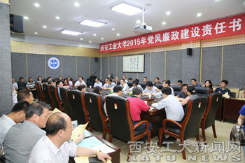 最后,党委书记赛云秀作了讲话。他指出,实行党风廉政建设责任制,是党中央做出的一项重要规定,是各级领导干部抓党风廉政建设的一种责、权、利相结合的管理制度,是党风廉政建设制度体系中的一项带有根本性的制度,全校各级党政领导班子和领导干部要把实行党风廉政建设责任制作为一条政治纪律认真执行,作为一项重大政治任务必须完成好;要自觉地把党风廉政建设工作与教学、科研、管理以及其他工作紧密结合,切实做到“两手抓,两手都要硬”!他指出,要想把党风廉政建设责任制这项工作抓好、抓实、抓出成效,签订责任书只是一种工作形式,关键是要抓好落实,必须做到以下三点:第一,要认真落实“两个责任”。党委主体责任与纪委监督责任是同一责任范畴的两个侧面,不能互相替代,更不能互相削弱,必须相互协调和共同促进。第二,要严格监督检查。纪检监察部门要切实负起责任,在实行党风廉政建设责任制中做好组织协调和监督检查工作,督促党员干部认真执行党风廉政建设责任制,积极开展专项检查。第三,要严肃责任追究。党风廉政建设责任制的核心是责任追究,如果没有严肃认真的责任追究,责任内容再清楚也很难认真履行,责任制规定也就成了一纸空文。今后凡是发生重大违纪违规的单位和部门,在追究直接责任人责任的同时,还要追究有关领导的主体责任。