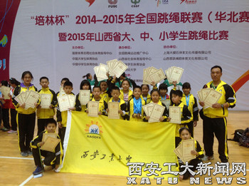 (本网讯4月17日至20日,由国家体育总局社会体育指导中心、中国大学生体育协会等单位主办的“培林杯”全国跳绳联赛华北赛区比赛在山西太原举行。来自北京、天津等十余省市自治区的58支代表队近千名运动员参加了比赛。由西安工大附属小学16名队员组成的跳绳代表队在教练贺中彬、杨丹的带领下参加了幼儿组、儿童组和成年组的角逐。他们发挥出色,58个项目中有35项进入前八名,59人次获奖,获4金8银9铜共21枚奖牌,贺中彬获“优秀教练员”称号。附小代表队还取得了参加5月14日至20日在辽宁大连举行的全国跳绳总决赛暨2015马来西亚亚锦赛选拔赛的资格。