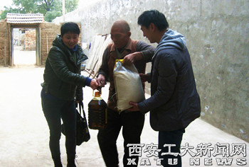 (本网讯)11月21日,在离退处副处长周晔和我校驻富平黄窑村干部王号辉的带领下,协同武装部、校团委的同志,前往赵春胜老人家中慰问。学校为老人送去了米面油等过冬物品,并关心询问了老人的生活状况和存在的具体困难,送去了学校的温暖和关怀。