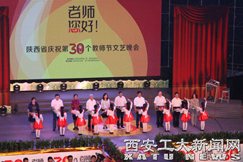 (本网讯)9月9日晚,由陕西省委高教工委、陕西省教育厅主办的陕西省庆祝第30个教师节文艺晚会在深情并茂的诵读声中拉开帷幕,省委高教工委书记李仲为等主要领导出席了晚会相关活动,我校人事处组织新入校教师等逾百人参加了本次晚会。