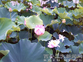 (本网讯)近期,一朵朵鲜艳夺目的荷花在我校西大门水池中竞相盛放,映日荷花别样红,为夏日的校园增添了一处美景,引来师生员工驻足观看,陕西电视台也做了专题报道。