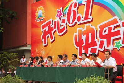 刘建勋副校长致辞,他向孩子们表达了诚挚的节日祝福,肯定了附小为大学的发展默默付出的努力,希望孩子们牢记胡锦涛总书记的教诲,争当“四好少年”,并希望大学各级领导能一如既往地关心支持附小发展。