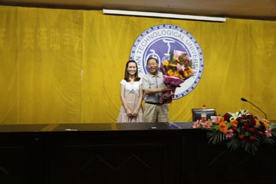 报告会后,我校经济管理学院2008级学生王谨娴向田永清将军敬献鲜花,田将军题词“心中有梦,梦想成真”赠与我校学子。