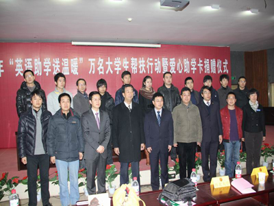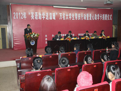 (本网讯)12月30日,共青团陕西省委“英语助学送温暖”万名大学生帮扶行动暨爱心助学卡捐赠仪式在乐玩在线客服未央校区举行。团省委副书记张小平、校党委副书记丁养斌、省学联副秘书长辛磊、校团委书记赵琼、四海嘉华科技有限公司(嘉学网)总裁文小红等出席。陕西科技大学、西安医学院、西安工程大学等全省二十多所高校的学生近400人参加了捐赠仪式。团省委学校部部长、省学联秘书长单舒平主持了捐赠仪式。