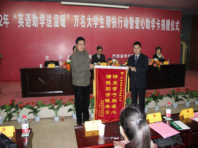 随后,省学联副秘书辛长辛磊介绍了团省委开展全团送温暖工作的开展情况。从捐赠方、活动的筹划到实施、捐赠对象的评选等方面作了全面的介绍。然后与会领导向学生代表发放网上英语学习爱心助学卡。张小平副书记为四海嘉华科技有限公司颁发锦旗。我校经管学院学生李永平作为受助学生代表发言,他非常感谢团省委以及学校的关心——通过发放爱心学习卡帮助他以及像他一样英语不好的贫困生,同时也非常感谢四海嘉华科技有限公司的捐助和支持,有了这些帮助,他们将在今后的英语学习过程中更加努力,提高自己的英语成绩,在以后的工作中,用今日之所学回报社会。