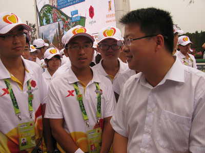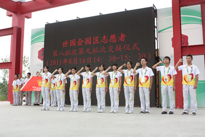 8月15日,西安工大和西安石油大学的志愿者从2011西安世园会第八批志愿者手中接过了志愿服务的大旗,我校的500名“小蜜蜂”正式开始了他们的世园会之旅。