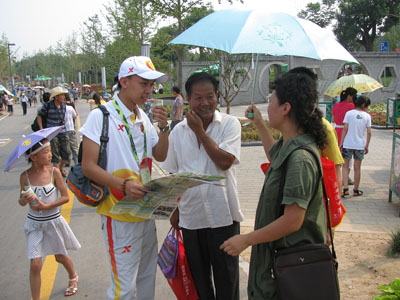我校的500名志愿者由未央、金花、雁塔和洪庆四个校区的学生组成,每天他们穿着整齐,精神抖擞,统一佩戴“乐玩在线客服志愿者”徽章,准时集合出发,在各自的服务岗位上独当一面,用灿烂的微笑、热情的态度熟练地为游客们提供导引、问询等服务,直到深夜才拖着疲惫的脚步返回学校。入园第一天,他们就经历酷暑和暴雨的考验。近期天气凉爽,游园人数剧增,工作强度加大,但是他们不惧压力,不畏困难,以最佳的姿态、最美的微笑、最好的服务站好每一班岗。此外,他们还在锦绣门、广运门等人流量密集的地方,开展了“古韵新声”——拼字组句与“低碳生活绿色时尚”—世园环保达人挑战赛等活动,与来往游客积极互动,其乐融融,为世园会增添光彩。