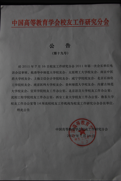 (本网讯)近日,在北京召开的中国高教学会校友工作研究分会2011年第一次会长单位会议上,我校校友联谊总会被批准加入中国高等教育学会校友工作研究分会,正式成为会员单位。