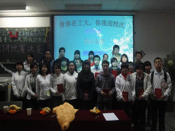 演讲比赛从10中旬开始面向全校公开报名,共有近百名同学以个人或团体的形式报名参赛。经过前期两轮初选,共有来自光电、机电、材化、电信、经管、计算机、建工、外语、人文、艺术等10个院系的23名选手入围决赛。在决赛过程中,各参赛选手情绪高昂、精神饱满,围绕主题进行了激情澎湃的演讲,表现出自己对于母校的热爱和真挚感情,每到精彩之处现场观众和参赛选手的亲友团都向自己喜欢的参赛选手呐喊助威,将“青春在工大,你我迎校庆”演讲比赛掀起了一个又一个的高潮。最终来自经管学院的张线同学(演讲题目:相约西工,共铸美好未来)、材化学院的张大宇同学(演讲题目:当我走进西工)分别获得本次大赛一等奖;人文学院李丹(演讲题目:身在西安工大,我心飞翔)、光电学院田翠萍(演讲题目:西工的足迹)、电信学院王鹏斐(演讲题目:西工工大,我与你同飞)等同学分别获得二、三等奖及优秀奖。