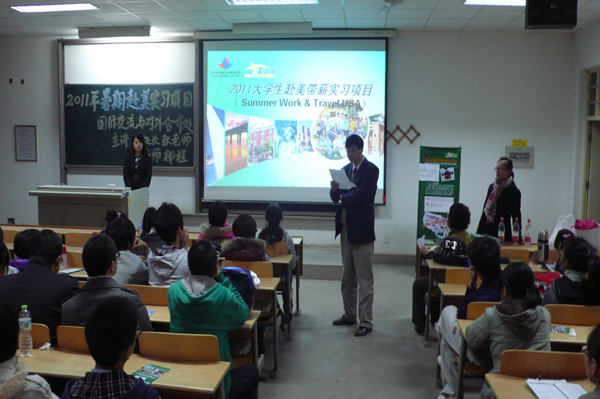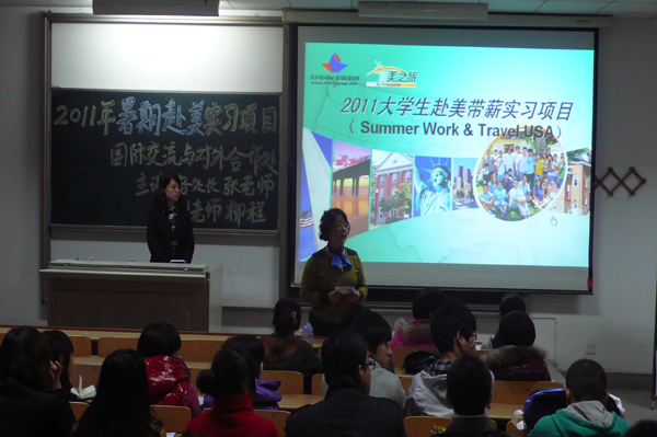 国际交流处教师张小萍、美之旅(西安办事处)工作人员刘晨详细解说了该项目的发展历史、政策及物质保证、优越条件及取得的突出成绩,并对学生关心的项目内容、流程、实习生住宿方式、项目费用和申请条件等问题回答了学生的提问。