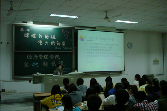 丁副书记首先通过几个简单的问题与大家互动,以了解大家对党的认识。然后讲解了四个专题——党的最终目标是实现共产主义社会制度;党在现阶段的任务是建设有中国特色的社会主义;深入了解全面建设小康社会的奋斗目标和坚定理想信念;干好正在做的事;让同学们更加了解了党,进一步加强了大家向党组织靠拢的愿望。讲课期间,丁副书记还联系了许多社会热点,使现场的气氛活跃,参加党课的学生都表示受益匪浅。
