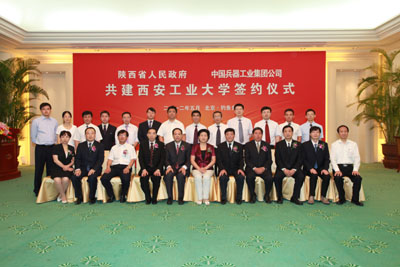 陕西省科技厅副厅长孙科、陕西省发改委副主任田建武、省国防科工办副主任刘普选;中国兵器工业集团公司政策研究室主任徐东良、科学技术部主任张冠杰、人力资源部主任张建平、西北兵工局局长刘建民、党群工作部副主任侯新;我校校长廉振民、副校长张君安、刘卫国出席签字仪式。
