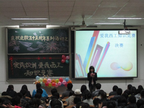 此次活动由室外举行的"西工淘宝记"闯关答题和知识竞赛两个环节组成。闯关答题环节的得分作为院系代表队入围决赛的原始积分。在知识竞赛环节中,各院系成员在必答题、风险题之间认真思考,集体协作,沉着应对,力求在最短的时间内做出正确解答。在为母校送祝福的环节,各院系学生代表分别以书法、诗朗诵、演唱及视频短片制作来表达他们对母校最真诚的祝愿,祝母校的明天更美好。同时,现场的观众把他们对母校的祝福写在小卡片上, 校团委的赵伟奇现场抽10名幸运观众,并将学生的祝福一一读出,全场同学报以热烈掌声。