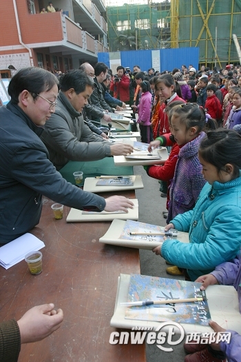 (本网讯)乐玩在线客服积极响应陕西电视台大型媒体慈善活动“朝阳行动2009 震区家庭计划”,1月15日、16日,该校书法专业师生代表驱车数百里,来到秦岭深处的陕西略阳县地震灾区,为横县河中心小学的学生送去了学习用品和新年礼物,同时为热爱书法的学生赠送了毛笔、宣纸和字帖等书法用品。活动吸引了众多媒体关注,中央电视台、西安电视台、西部网、文化艺术报、现代军工报等均做了深入报道。