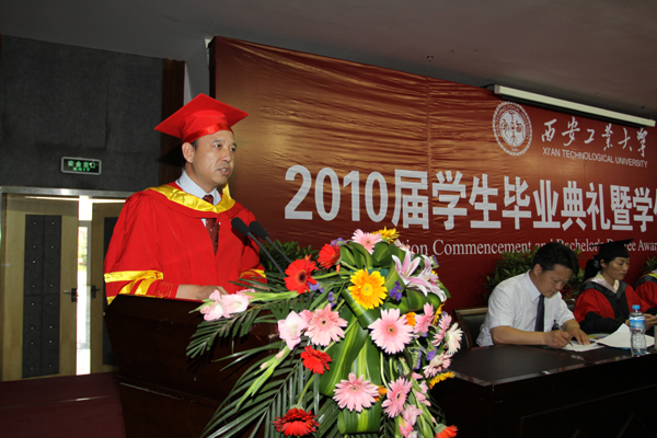 建工学院2010届毕业生胡溪同学代表全体毕业生发言,表示不辜负西工的培养,不辜负老师的教诲,努力践行“忠诚进取、精工博艺”的办学传统,在各自的岗位上努力工作,争做国民表率、社会栋梁,为西工争光,同时祝愿母校桃李满天下,全体教师身体健康,祝愿全体学弟学妹学业有成。