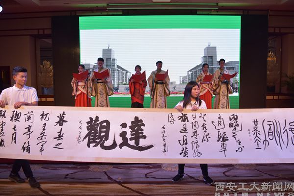 晚会在《重返十七岁》歌舞中拉开了序幕。优秀青年歌手柳强强的用具有浓郁特色的陕北民歌为中国书法学院送上了祝福。唢呐独奏让全场感受了民乐的魅力,书法表演《青花瓷》用余音绕梁的民乐、遒劲有力的笔锋展示了传统的魅力。歌手任静演唱的《陕西故事》、《丝路幸福》用真挚的感情,唱出了陕西人自豪。歌手郭涛在演唱过程中,用自己的亲身经历鼓励同学们,用手中毛笔书写青春。舞蹈《青衫红袍》用优美的曲调、曼妙的舞姿尽显我校大学生清新活泼的青春风貌。相声《欢歌笑语》更是给大家带来了欢笑,魔术表演使大家惊叹之余赢得了大家阵阵掌声。