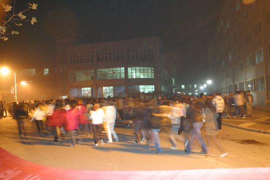演练现场,随着丁养斌副书记宣布演练开始,几股浓烟从1#、2#学生公寓漫出,“火灾”随时有蔓延趋势,情况万分危急。保卫处、宿舍管理人员发现险情后,通知广播台拉响警报,并按照学校处置火灾预案迅速组织对该楼人员进行疏散并开展搜救工作。3分钟后,疏散及搜救工作结束,居住在该楼的4300余名学生安全撤离“火场”,各院系总支书记、辅导员迅速到达现场指挥学生疏散,11500余学生被有序疏散至指定安全地带。与此同时,保卫处总值班室在接到报警后,迅速调动警车、电动巡逻车和应急分队人员赶往“火灾”现场,按照应急预案展开灭火行动;校医院设立临时医疗救助站,医护人员随时待命。5分钟后,“大火”被完全扑灭,险情全部解除。