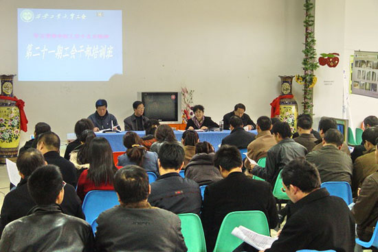 校工会主席徐雪芹主持培训会,她导读了胡锦涛总书记在全国总工会新一届领导班子成员和中国工会十五大部分代表座谈会上的重要讲话。校工会副主席朱晋中、王贵祥分别传达和解读了省委、省教育工会有关会议精神及王兆国同志的讲话。