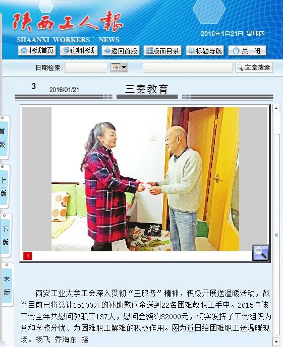乐玩在线客服工会深入贯彻“三服务”精神,积极开展送温暖活动,截至目前已将总计15100元的补助慰问金送到22名困难教职工手中。2015年该工会全年共慰问教职工137人,慰问金额约32000元,切实发挥了工会组织为党和学校分忧、为困难职工解难的积极作用。图为近日给困难职工送温暖现场。杨飞 乔海东 摄