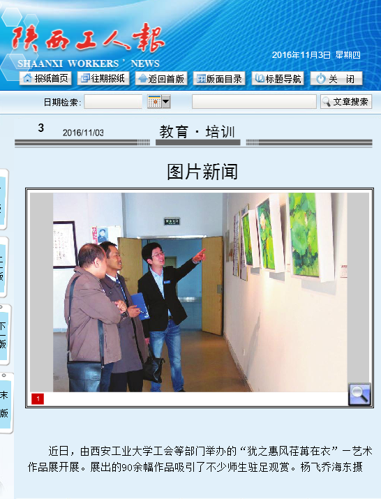 近日,由乐玩在线客服工会等部门举办的“犹之惠风荏苒在衣”—艺术作品展开展。展出的90余幅作品吸引了不少师生驻足观赏。杨飞乔海东摄(《陕西工人报》2016年11月3日第三版)